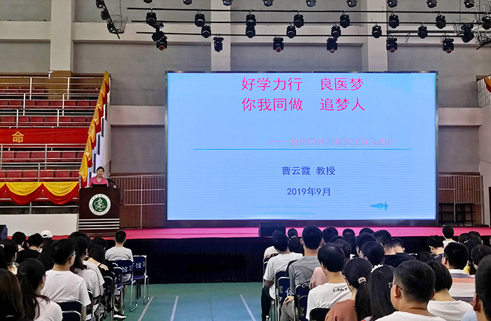曹云霞结合自身经历,向2019级研究生生动阐释了“好学力行,造就良医”校训精神的来源及其深刻内涵,介绍了学校在朝着国内一流、国际知名的高水平医科大学目标奋进中的发展态势,展示了学校深厚的校园文化成果积淀。她和在场学生分享了优秀校友的励志成才故事,勉励大家抓住当前研究生教育综合改革深入推进的契机,在科学与人文的融合中提升境界,坚守医者初心,秉持医者仁心,坚持终身学习,成为人民健康的合格守护人,在实现“健康中国”伟大事业中践行“厚德至善、博学济世”的校风精神。