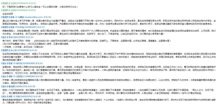 此外,为应对因网络或平台系统崩溃引起的特殊情况,所有课程均提前准备应急预案,通过平台或者建班级QQ群、微信群上传课程教学PPT、练习题等,引导学生自主学习。课后,各学院组织教师进行经验分享,组织学生交流开学第一课学习心得体会,为进一步完善线上教学工作提供经验。