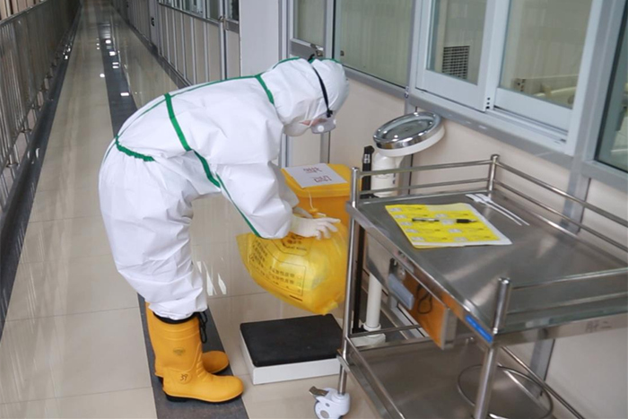 据了解,该院新冠病房内与患者有接触的所有垃圾都被视为“新冠”医疗废物,除隔离服、口罩等医用防护品外,饭盒、纸巾、筷子甚至报纸等都由专业人员密封处置并在24小时内迅速转运。标有“新冠”字样的醒目黄色垃圾袋、垃圾桶专门用于装袋和转运。为防止交叉感染的发生,医院专门处理“新冠”医废的人员身穿防护服对垃圾袋采用鹅颈结式特殊手段进行包扎密封,经称重记录、消毒喷洒、扫码确认等多重环节处理后,从专用通道运送至医院的垃圾固体废物暂存处置中心。暂存处置中心为普通固废和“新冠”医废开辟双门分开清运,即一个用来运送普通医疗废物,一个专门用来运送新冠医疗废弃物。