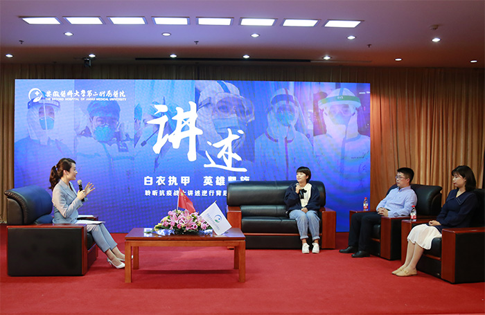 活动现场,该院支援湖北省及省内多地的医疗队员以及在新冠肺炎病房奋战的抗疫英雄代表费君、何晓丽、孙昀、曹爽、黄兵、郑凌等在访谈中用饱含真挚情感的话语讲述了他们在疫情防控一线工作的故事,带领现场观众重温了那一段令人难忘的特殊时光。据悉,作为安徽省新冠肺炎医疗救治省级定点医院之一,该院医护人员自疫情发生以来,舍小家顾大家,耐心细致照顾每一名患者,为全国和我省的疫情防控作出了重要贡献。