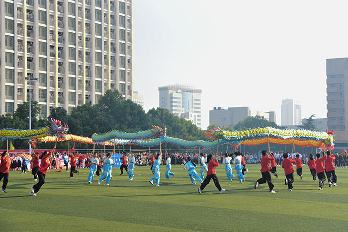 由武术世界冠军、我校教师王雪带领校太极拳教学训练团、校武术队联袂出演的《太极功夫扇》令人眼前一亮。同学们在挥扇合扇间将武术与太极相结合,气势磅礴却又行云流水,展现出中华优秀传统文化的独特魅力,让现场观众近距离感受太极的气韵之美。