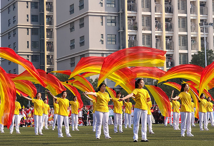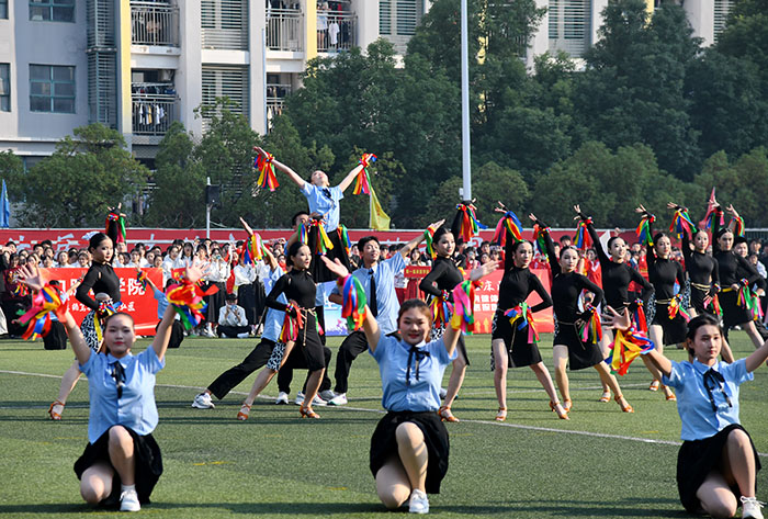 悠扬的音乐声里,第一临床医学院带来节目《炫彩青春》。鲜亮的绸带在学子手中上下翻飞,一条条彩龙穿梭其中,象征着新时代安医青年意气风发、乘势而上。第一附属医院啦啦操节目《青春抛物线——爱 》随后登场,该院体育爱好者们笑容灿烂,迎着朝阳欢快挥动着手中的红色纸球,向全校师生展示医护职工饱满的精神和飞扬的青春。