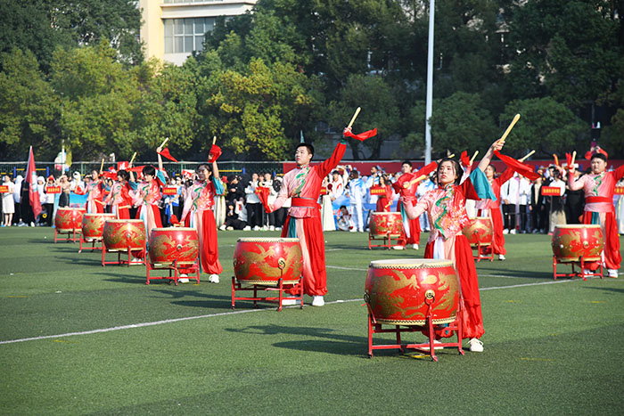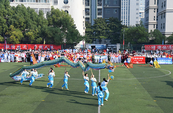 开幕式表演环节,由各单位踊跃参与、精心编排的6个精彩节目轮番上演。伴随着激昂的音乐,公共卫生学院《鼓舞飞扬》闪亮登场,该院学子强劲有力地挥舞鼓棒,以整齐划一的动作敲击出隆隆鼓声,瞬间点燃全场氛围。第二临床医学院选取杭州亚运会开幕式曲目《同爱同在》,学子们在表演中将欢快的韵律操与热烈的拉丁舞完美融合,轻盈的步伐和灵动的身姿释放青春活力,展现出运动的力与美。
