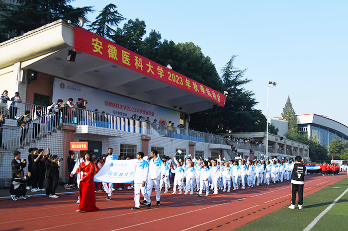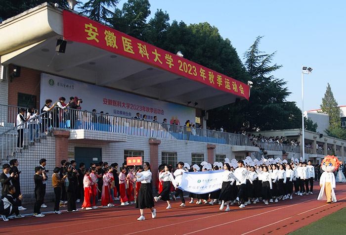 开幕式运动员入场仪式上,我校20支学生代表队和24支教工代表队迈着稳健的步伐依次走过主席台。值得一提的是,此次还有一支“冠军组”代表队参加入场仪式。1959年全国运动会选拔赛上打破女子100米校纪录的蒋云仙老师精神矍铄,她和我校多位国内国际比赛中获冠军的教师一起,携45名冠军学子们昂首阔步走过主席台,展示出体育精神在安医代代传承和发扬。