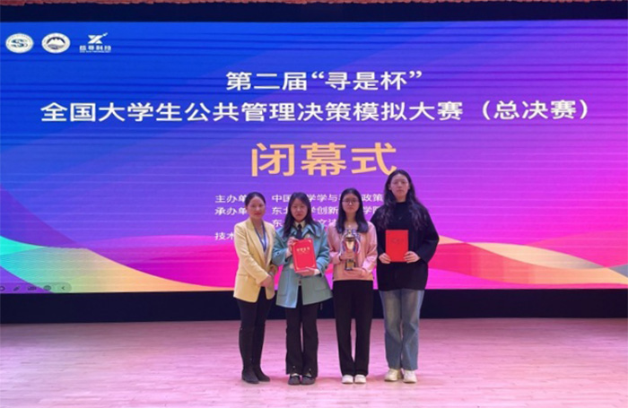 10月27日至29日,第二届“寻是杯”全国大学生公共管理决策模拟大赛(总决赛)在辽宁沈阳举行。我校卫生管理学院2021级公共事业管理专业颜羽赫、肖妮可,以及劳动与社会保障专业严子怡三名同学组建的项目团队发挥出色,荣获全国总决赛二等奖。