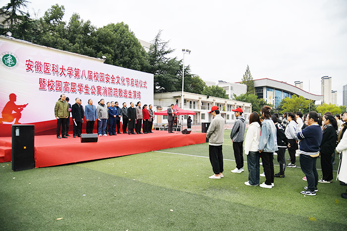 11月10日,我校第八届校园安全文化节启动仪式暨高层学生公寓消防疏散逃生演练活动在校本部举行。副校长、演练总指挥肖圣龙出席启动仪式,全程观摩指导演练并讲话。