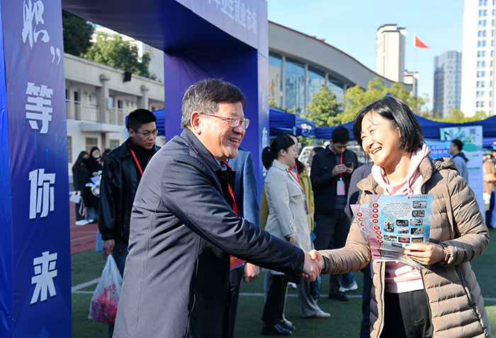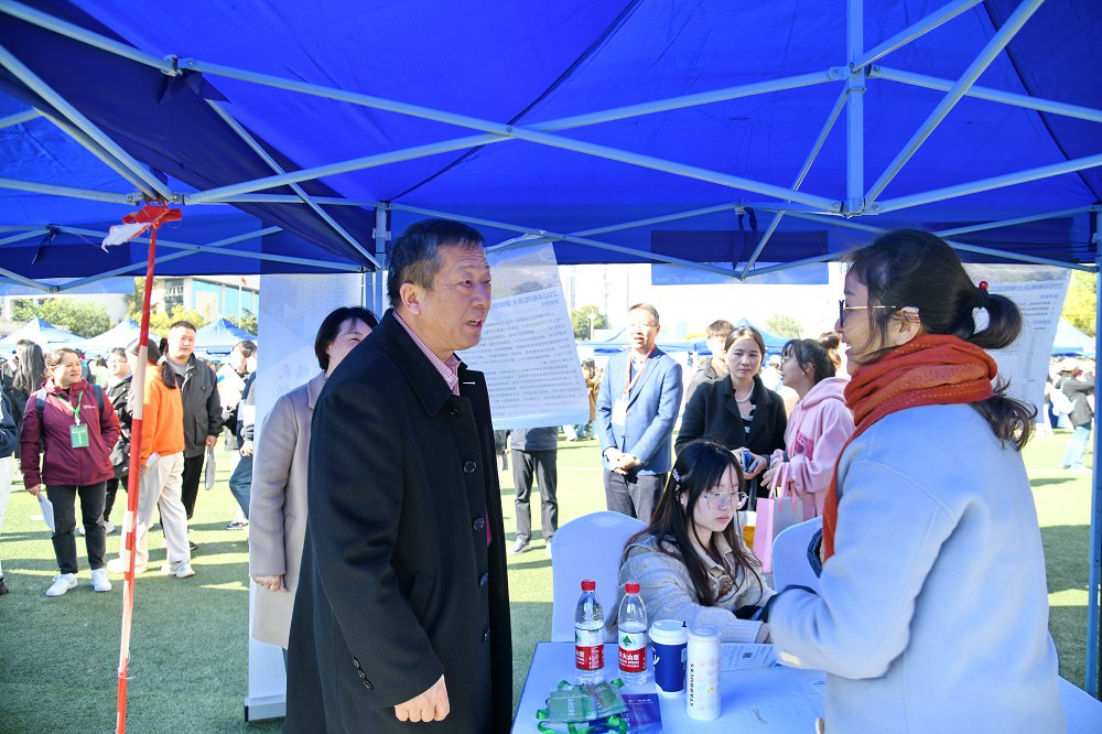 11月18日,学校“就在今冬 职等你来”2023年冬季专场招聘会在梅山路校区体育场举办。校党委书记顾家山、党委副书记谢瑞瑾、副校长肖圣龙前往招聘现场,在各用人单位招聘展位走访了解情况,并与各用人单位、毕业生代表亲切交流。