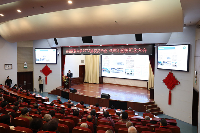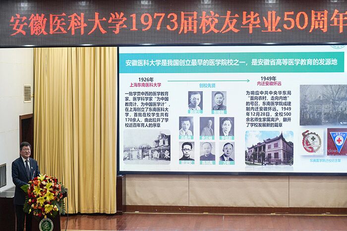 大会在雄壮的国歌声中拉开帷幕。顾家山代表学校,向从全国各地重返母校的73届校友表示热烈的欢迎和诚挚的问候,对校友们长期以来给予学校建设与发展的关心与支持表示感谢。他和校友们一起回顾了学校的历史发展沿革,并通过一张张泛黄的老照片,让现场校友重温了在安医度过的难忘青春岁月。他表示,1973届校友作为首届工农兵大学生,是当年各个战线涌现出来的优秀青年代表。校友们始终牢记党和人民的教导,始终牢记“健康所系,性命相托”的医学誓言,无愧母校的辛勤培育和老师们的殷切希望,在医疗、科研、管理等各个领域奉献了自己的无悔青春,为人民的健康、为祖国的医疗事业作出了重要的贡献,值得母校骄傲和自豪。