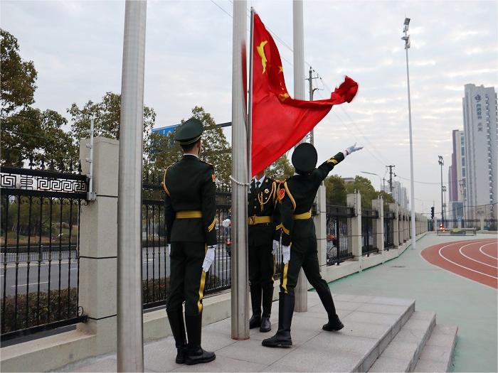 旭日东升,脚步铿锵。上午7时,清亮的口令声犹如破晓的洪钟,国旗班护旗方阵迈着整齐划一的步伐向升旗台走去。国歌奏响,五星红旗冉冉升起。全体师生目光坚定,凝望着与初阳相辉映的五星红旗,怀着赤诚的敬意,向国旗行注目礼。