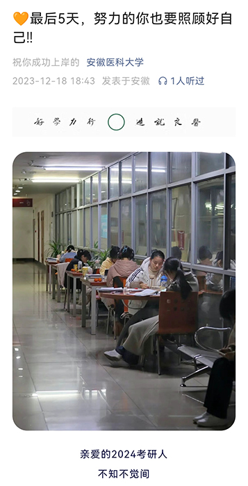 “加油,学长学姐们!”“你们的路途并不孤单,如果累了请回头看看,你们身后有为你们加油的安医人。”“上岸!”在学校官方微信公众号推出的“考研倒计时”系列推文的评论区里,一条条留言都是给予考研学子的美好祝福。