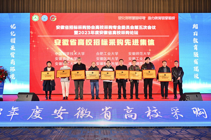 1月11日,安徽省招标采购协会高校采购专业委员会(简称“专委会”)第五次会议暨2023年度安徽省高校采购论坛在合肥落下帷幕,省发展改革委、省教育厅、省财政厅相关领导,以及来自省内高校和代理机构的专委会53家成员单位代表参加论坛。我校获“安徽省高校招标采购年度先进集体”荣誉称号。