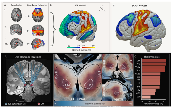 该IGE网络在丘脑的峰值点与深部脑刺激(DBS)治疗IGE的最优靶点位置高度一致(MNI坐标: x = -9.05, y = -21.07, z = -0.07),均位于中间内侧(CM)核团。在21名DBS调控CM核团的IGE患者中,19名患者的癫痫发作频率下降了50%以上。这表明IGE网络与DBS有效调控癫痫的靶点在空间上高度一致。研究将脑影像的发现与DBS靶点整合得为一个统一的IGE脑网络,对开展IGE的精准靶点调控治疗提供了新的线索。